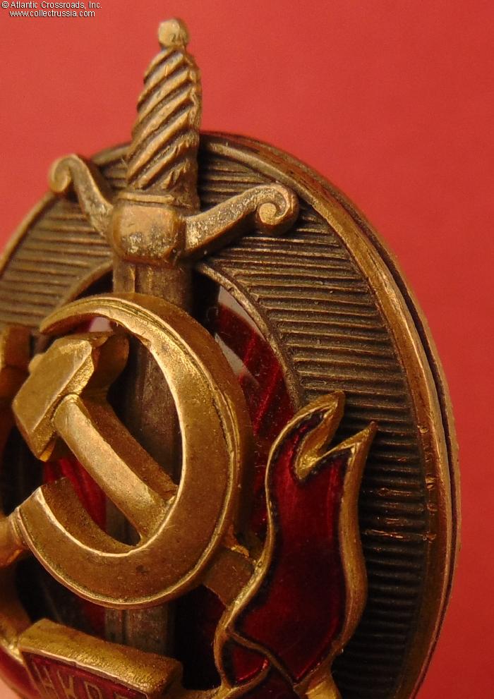 In very fine condition, outstanding for the highest NKVD award of WW2 vintage. The enamel on the red scroll is extremely well-preserved, completely free of the usual chips, flaking or repairs, and exhibits a beautiful luster. It has only some tiny hairlines in the upper left segment that caused a darker appearance in the area but apparently do not threaten the integrity of the enamel.