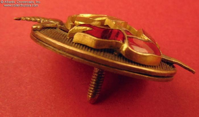 Brass, enamels; measures 42.5 mm in overall height; the oval "egg" portion is 33.4 mm tall, 26.6 mm wide; weighs 15.9 g without the screw plate. Four-piece construction: the oval back plate, O-shaped part with horizontal lines, sword, and the scroll with hammer & sickle emblem are separate parts held by wires. The serial number is engraved in standard manner under the screw post.