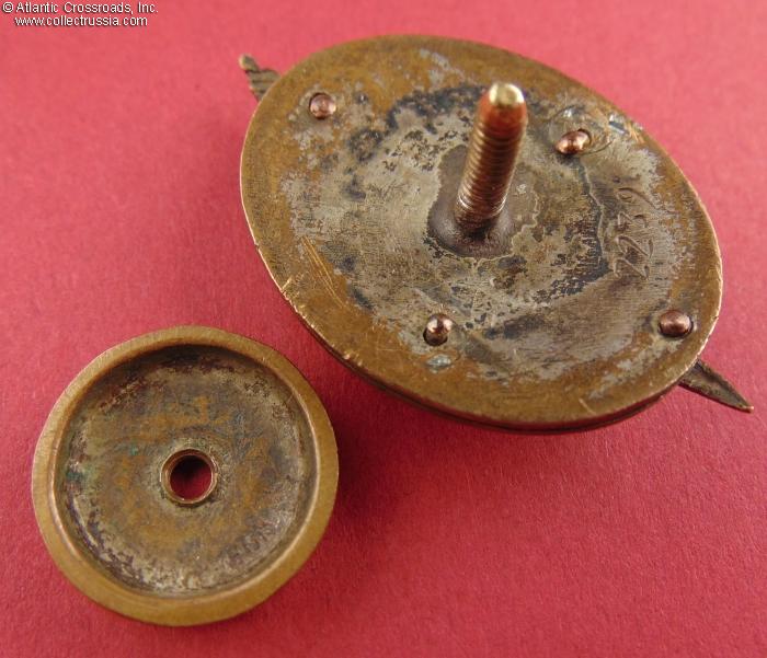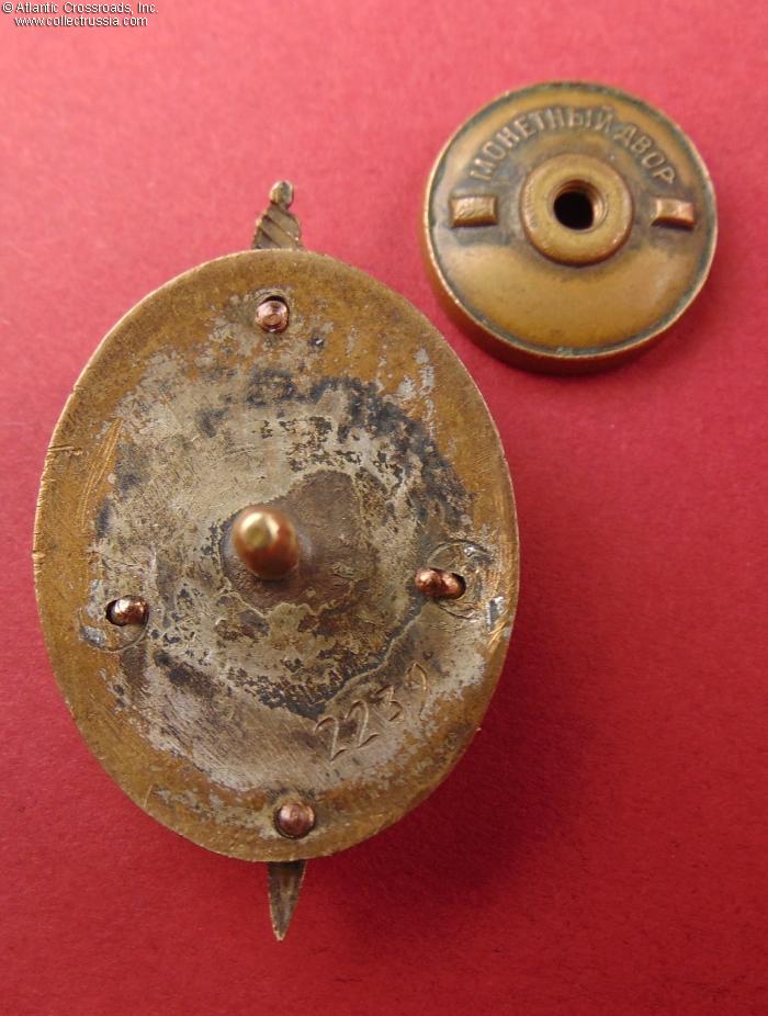 The wires holding parts of the badge are original, intact and tight; all parts align perfectly and show an equal amount of wear and patina. The screw post is original and measures approximately 13 mm in length?it has not been reduced. The badge comes with its original, characteristically thick screw plate with the mint logo, measuring 18.4 mm in diameter and weighing 4.0 g; as far as we know, this kind of screw plate is unique to the Distinguished NKVD Employee badge.