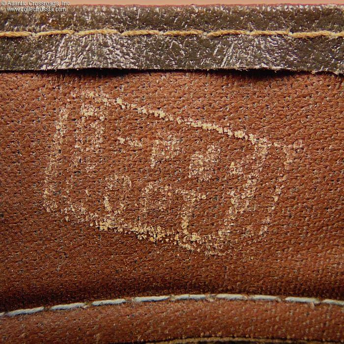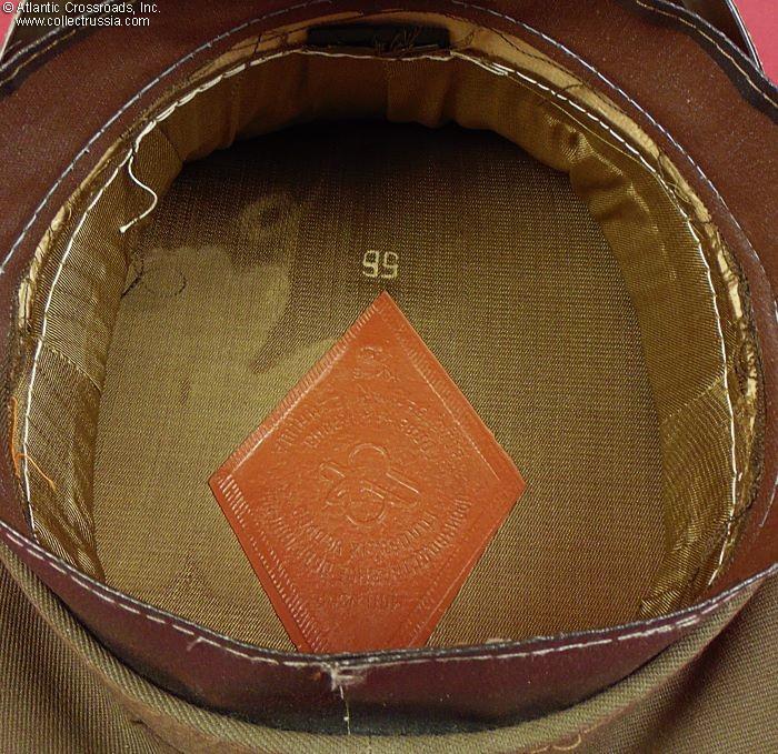 In olive drab wool blend twill, without piping. Subdued OD hat badge and matching side buttons in plastic. The sweat diamond shows the logo of the Kiev Headgear Factory and a 1987 date of manufacture. Size 56 (US 7 / Medium) is stamped in white on the liner. There is a factory quality control stamp to the underside of the sweat band.