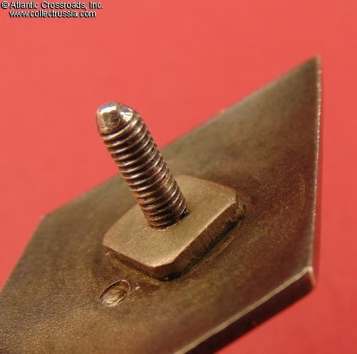 The details of the state emblem are perfect and exceptionally crisp; its original gold plating is extremely well-preserved. There is an attractive even patina to silver on both sides of the badge. The screw post is full length, nearly 9 mm measured from its square base, and includes an original screw plate with the mint logo.