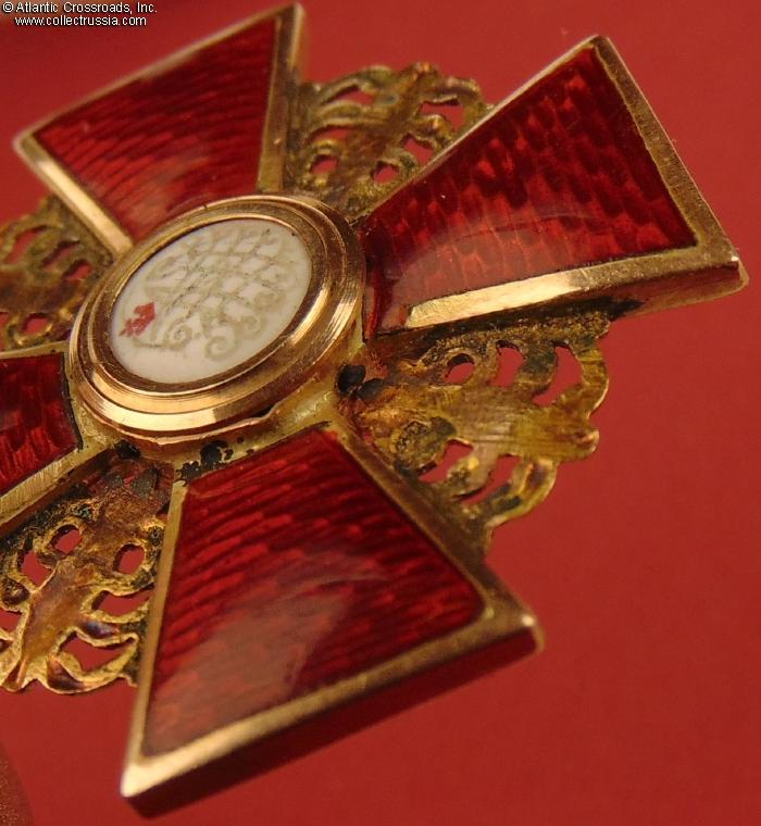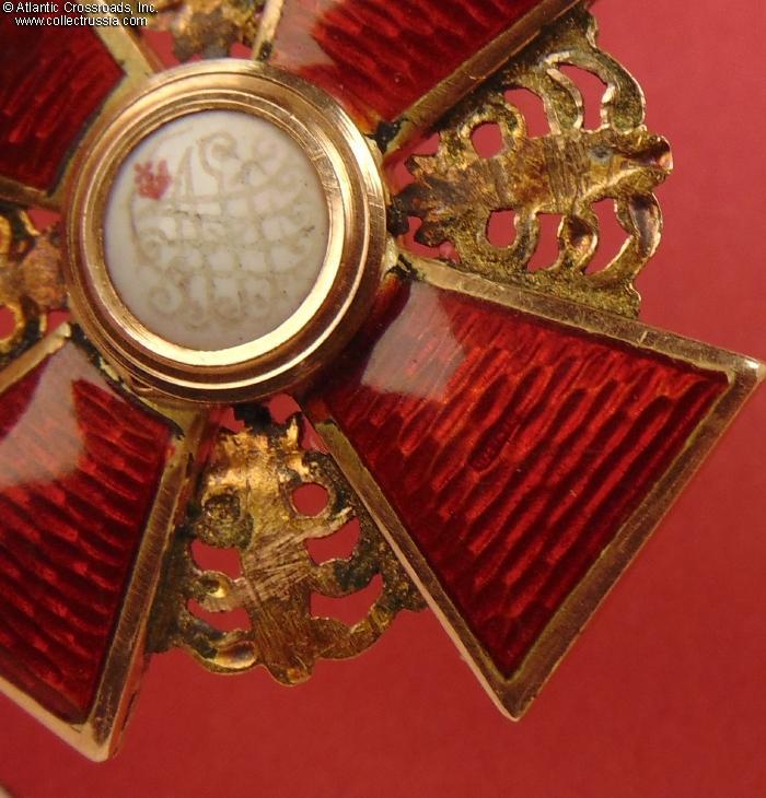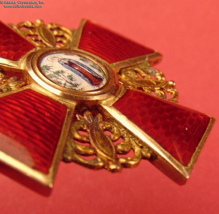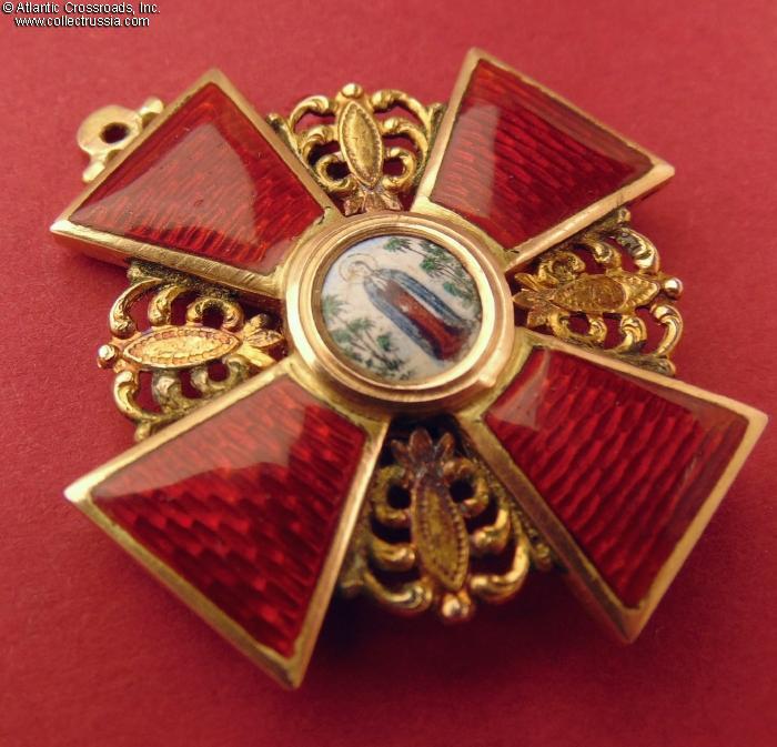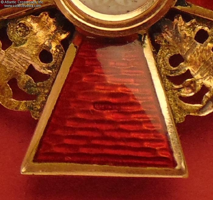 The depiction of St. Anne and foliage is very detailed as typical of the Eduard manufacture. The reverse shows maker mark "Eduard" under the enamel on the lower arm and Cyrillic mark ВД ("VD", the initials of Vera Dietwald, the widow and heiress of the original owner of the firm) on the upper arm. The eyelet shows "56" gold hallmark with "Kokoshnik" (the latter is poorly struck and partly worn out but still discernable). Additionally, a very clearly struck "Kokoshnik" hallmark appears on the obverse of the golden ornament between the right and lower arms of the cross. Note the dot under the chin of the Kokoshnik-wearing lady, which designates the St. Petersburg assay inspection.
