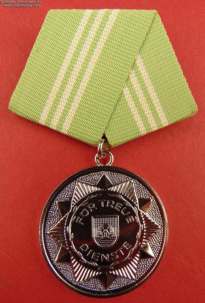 The Medal for Faithful Service in Militarized Organs of the Interior Ministry ("Medaille für Treue Dienste in den bewaffneten Organen des Ministeriums des Innern") was established on 22 January 1959 in six classes: 5 years service (bronze), 10 years service (silver), 15 years service (gold), 20 years service (gold), 25 years service (gold), and 30 years service (gold). The three highest grades had a red suspension ribbon with yellow stripes.
