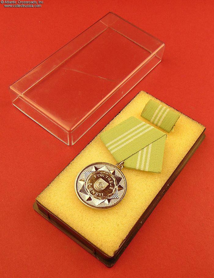 In chrome-plated brass, measures 32 mm wide. The inscription encircling the police shield on the obverse reads "For Faithful Service". Three white stripes on the suspension ribbon and the silver color of the medallion signify 10 years of service. The presentation box has black plastic bottom lined with light foam rubber inside, the lid is in Plexiglas.