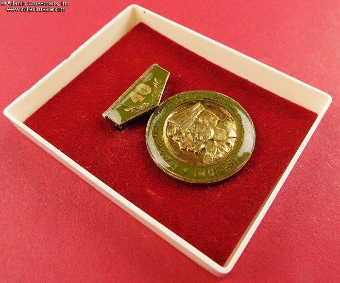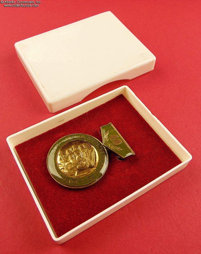 In brass, paint, and clear resin. The medallion is 33 mm wide. The inscription encircling the bas-relief in the center medallion reads "40th anniversary of the German People's Police. In Service to the People." The issue box is in plastic, with the fitted space on the bottom cut out of cardboard finished with ersatz short-nap velvet.