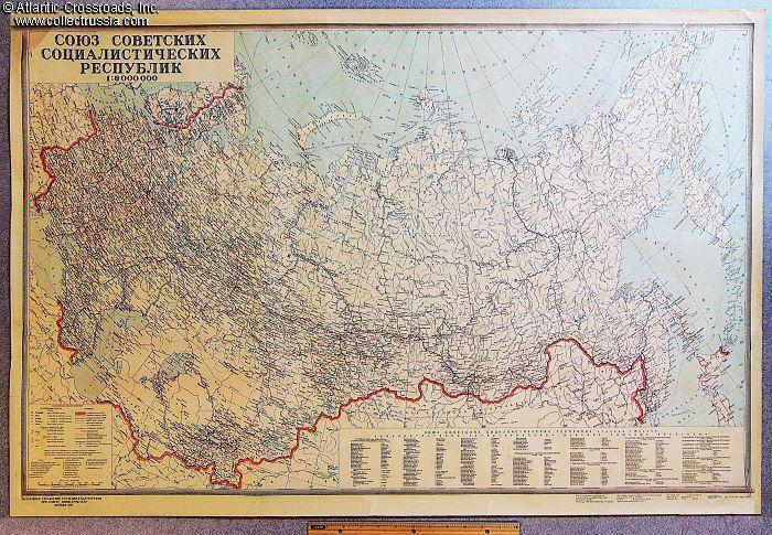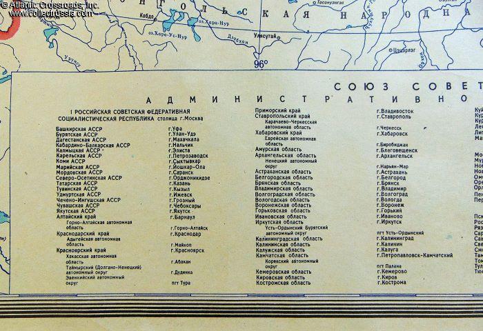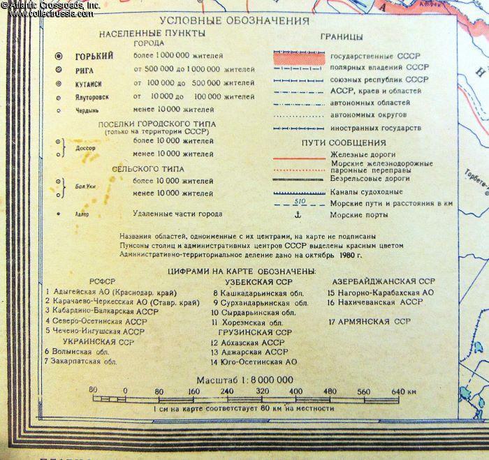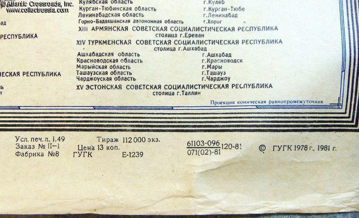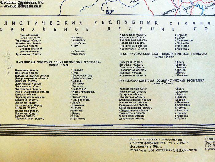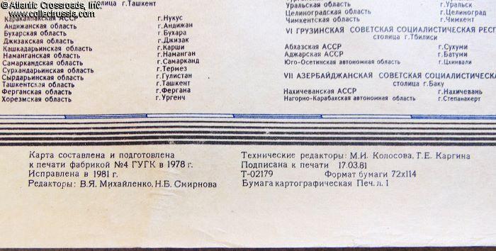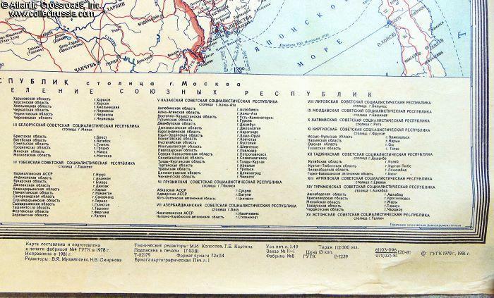 Large format measuring 43 ½" x 28", perfect size for mounting on a wall. Published by the Chief Cartography Directorate, circulation 112,000, rather low considering the number of school classrooms, offices, and residential apartments this map was intended for. The map was compiled in 1978 and updated in 1981. Includes a detailed legend and a complete list of republics, territories, and regions with their administrative centers.