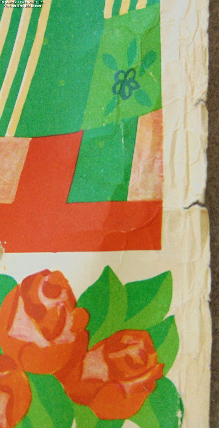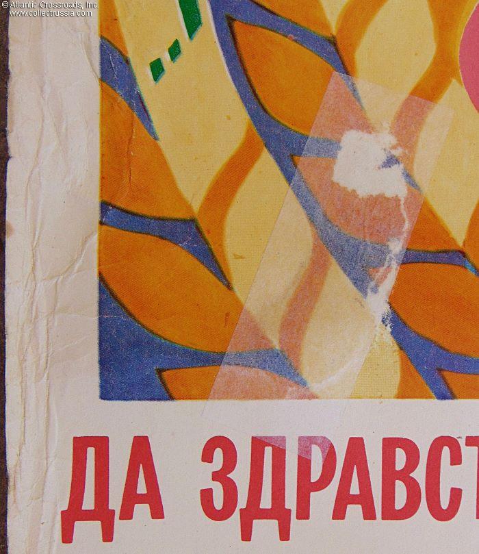 In good to very good condition. The edges show moderate wrinkling, fraying, and small tears (two larger ones have been repaired with tape on the verso). A piece of surface layer of the paper, partially torn of, has been reattached with transparent acid-free tape. The tip of that piece was missing, leaving a dime-sized spot of white underlying paper visible. However, the poster presents very well due to its large size and variety of imagery.