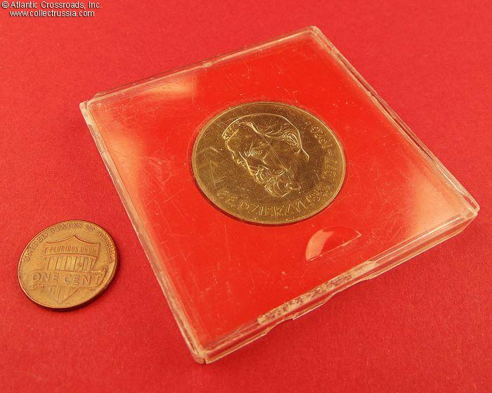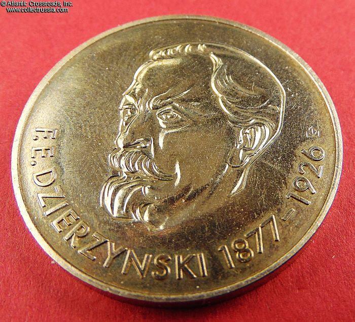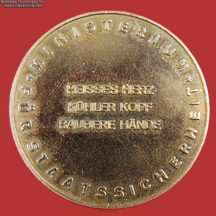 In silver colored nonferrous metal, 33 mm wide. The obverse features a bas-relief of Felix Dzerzhinsky ("Dzerzhynski" is the accepted German spelling of his name), with his name and years of life underneath. The raised inscription encircling the reverse reads "Ministry for State Security." Inside the inscription is a quotation ascribed to Dzerzhinsky: "Hot heart, cold head, clean hands." According to the Bolshevik lore, and perhaps factually true, Dzerzhinsky instructed his operatives that a true Chekist must have a hot heart, cold head, and clean hands. The coin comes in its