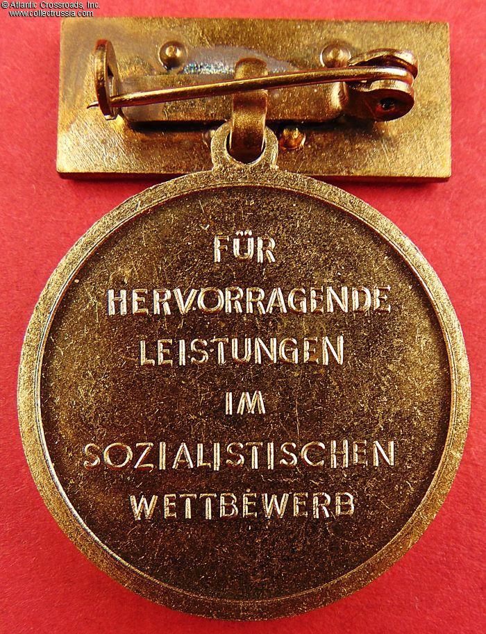 The medallion is in steel with gold-colored coating, measures 30 mm wide. The suspension is in paints and clear resin, and shows the images of the badges of FDJ ("Frei Deutsche Jugend", Free German Youth, similar to the Soviet Young Communists League aka Komsomol) and FDGB, Free German Trade Union Federation which awarded these medals to deserving FDJ members, workers of state-owned companies, for outstanding performance in their workplace. The raised inscription on the reverse reads "For outstanding achievements in socialist competition." The medal comes with its original issue case in