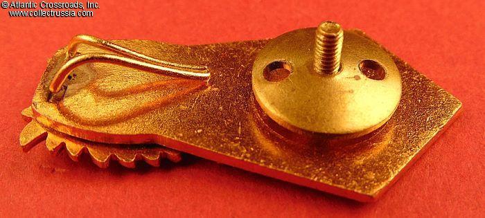 In brass and enamels, measures 40 mm in height, 23 mm in width, 2-part construction with a screwback attachment. Two-pronged bracket is soldered on to the reverse for hanging the pendant with the number of jumps.