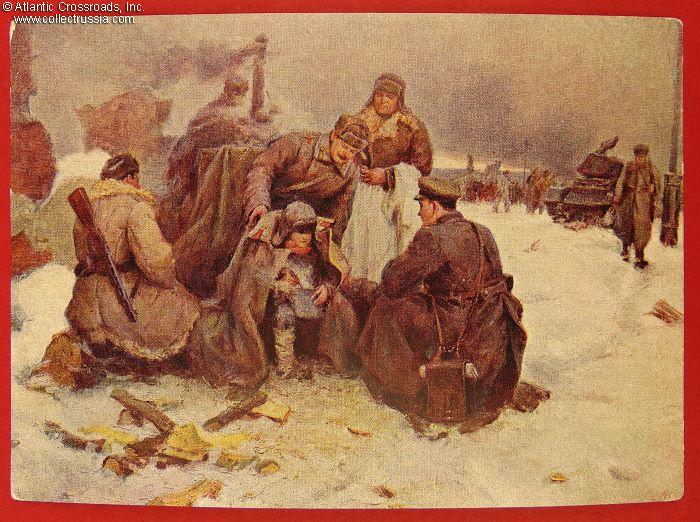 The size is continental standard 6" x 4", postally unused and unmarked, possibly part of a set. Published by the Soviet Artist Publishing House, circulation 40,000, very small by Soviet standards. The artwork is an offset print of a large oil-on-canvas painting by Yu. Vnodchenko, depicting a group of Red Army soldiers caring for a boy, apparently found among the ruins of the village just liberated from the Nazis.