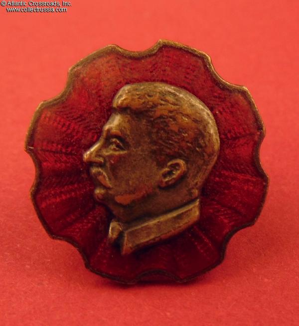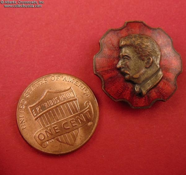 Silver-plated brass and enamel, measures 21.7 mm in height x 21.2 mm in width; weighs 5.7 g without the screw plate. Two-piece construction, featuring a bas-relief portrait of Stalin superimposed on ared enameled "rosette".