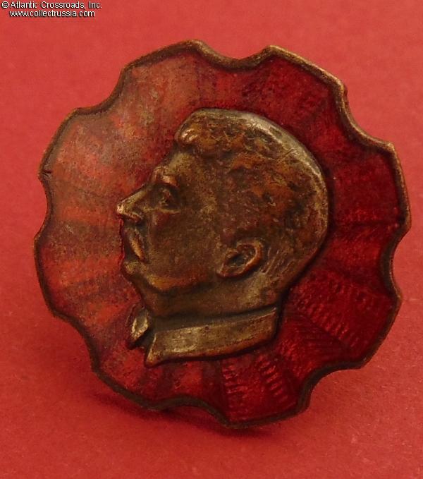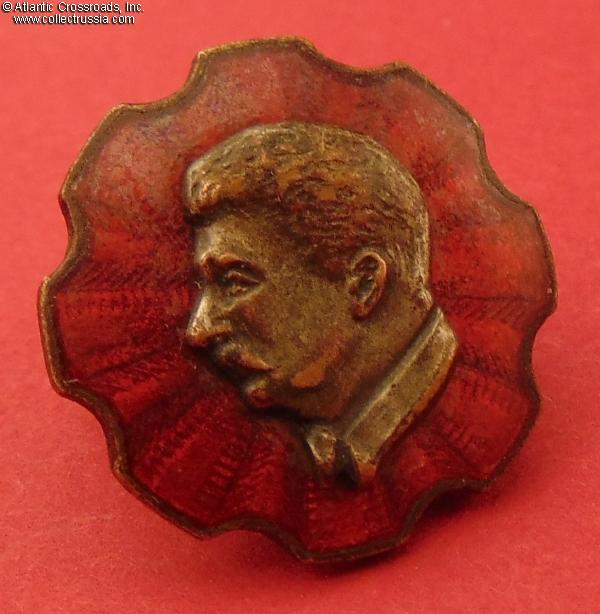 "Shock Worker" Award Badge featuring Stalin's portrait on red enameled "rosette", 1939.
