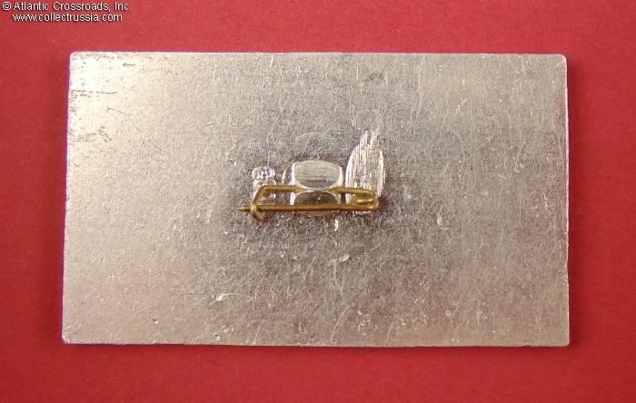 Aluminum, "cold" enamels; 30.1 x 50.4 mm. The badge is larger and features far more elaborate artwork than typical VLKSM conference badges of the period, likely due to the significance of the city of Ulyanovsk (formerly Simbirsk) as Lenin's birthplace. Excellent condition.