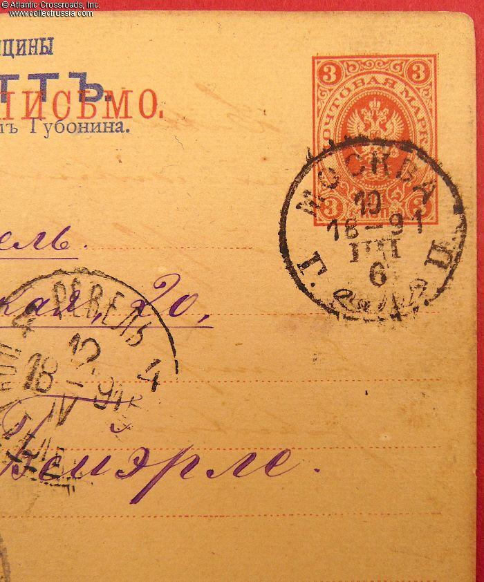 The size is standard 5 ½" x 3 ½", with a pre-printed 3-kopek postal stamp and the Russian Imperial double-headed eagle on the obverse. The postcard shows a stamped return address of G. Vitt, a doctor of medicine. Note that there were no house numbers in Russia at that time; correspondence was addressed to the street name and the name of the owner of the building. Interestingly and uncommonly, the obverse has not two but three consecutively dated cancels: Moscow, St. Petersburg, and Revel. Apparently, St. Petersburg's post office not only served as a relay point on this postal route but had to stamp the correspondence passing through.