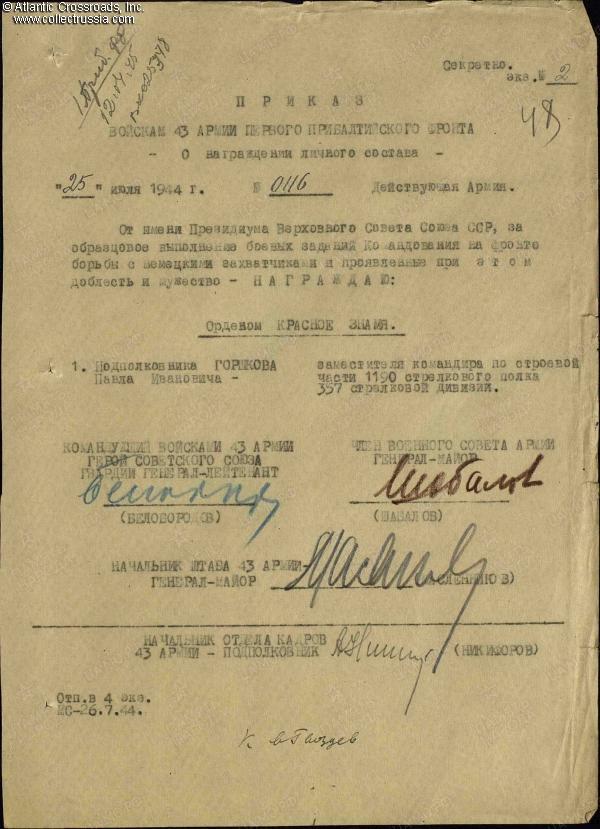 Pavel Gorshkov was born in 1902 in a village in Ryazan Province of the Russian Empire, about 140 miles southeast of Moscow. In 1924, he joined the Red Army and eventually became a cadre officer. He was on the front of the Patriotic War since day one, 22 June 1941. In July 1944 he had the rank of Lieutenant Colonel and served as Deputy Commander of the 1190th Rifle Regiment, 357th Rifle Division, 43rd Army, 1st Baltic Front. Having liberated the Belorussian city of Lepel, the army was advancing in northwestern direction, now through Lithuania. On 20th July, Gorshkov's rifle battalion was encircled and fought for five days and nights repelling attack after attack. On 25 July, Gorshkov succeeded not only in extricating his troops from the trap, but also in doing so without losing any lives. For that feat and for distinguished performance during the fighting to liberate Lepel, Gorshkov was recommended for the Order of the Red Banner which was awarded to him on 25 July 1944 (#115543).