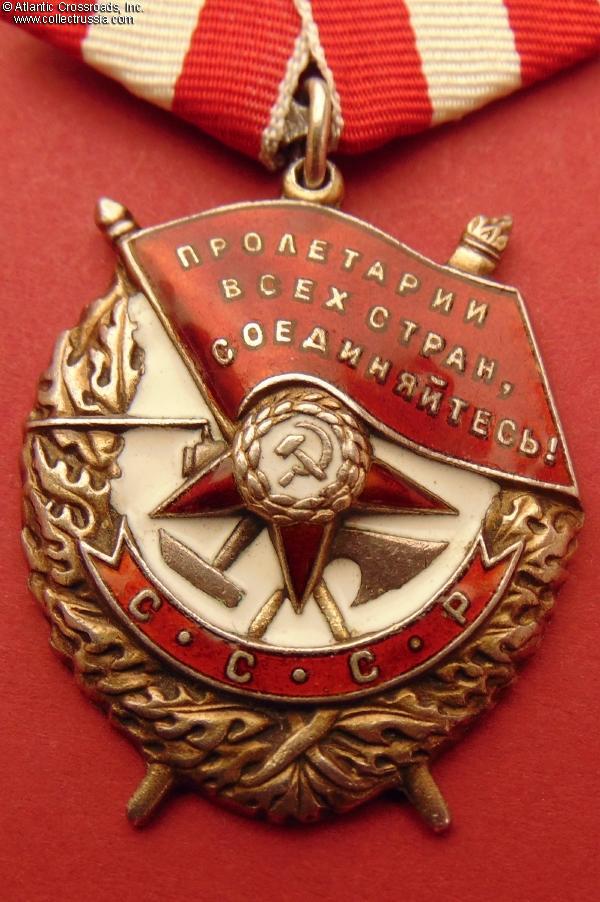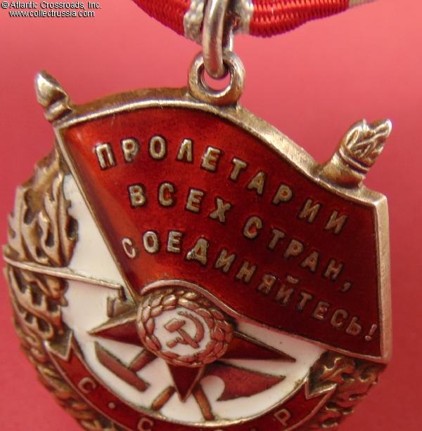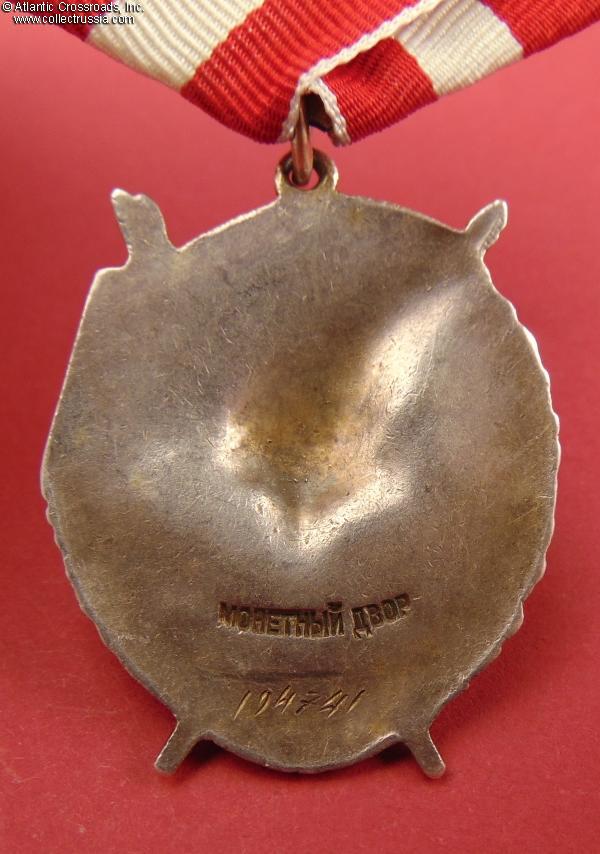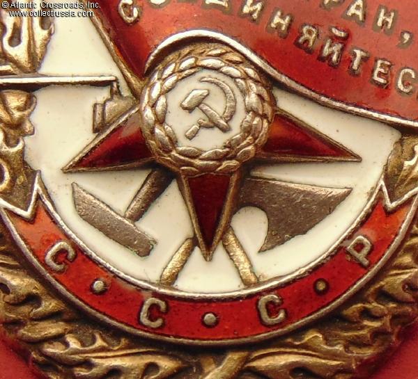 In very fine to excellent condition. The enamel appears almost perfect to the unaided eye and retains a beautiful luster everywhere; there are only a few minuscule surface flakes to the red enamel, all of them nearly unnoticeable without magnification. Much of the original gilt is present. There is a very attractive even toning to the silver on the reverse. Comes on an original WW2 suspension, a two-layer model in steel with a self-locking pin. The ribbon is new (from old unused Soviet stock). The connecting link appears to be original, and its ends are joined with solder.