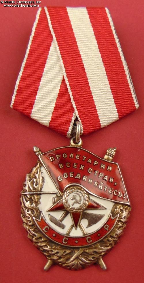 The medallion is in silver gilt and enamels; 45.7 mm tall (incl. eyelet), 37.5 mm wide; weighs 27.3 g not including the suspension and connecting link. Manufactured in 1945 at the Moscow Mint (note that the award decree probably came earlier than the date of manufacture e.g. the order could be "issued" before it was manufactured and actually delivered to the recipient.) Features a curved-up mint mark in small font, with a curved dash above the last character in the word "Monetnyi". This is a very uncommon variety: its known serial number range is from 189839 through 197976. /Durov & Strekalov, The Order of the Red Banner, p. 132/.