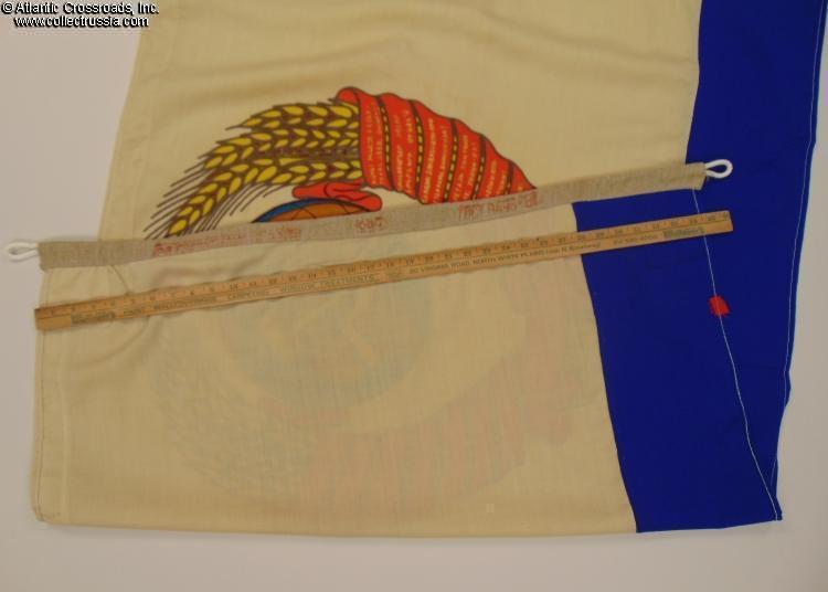 In wool bunting. Medium size, 54" x 35" (approx. 4.5'x3'). This uncommon flag is like a regular Soviet naval ensign but instead of the star and hammer & sickle emblem it has the national emblem of the USSR. The canvas hoist sleeve shows the manufacturer's name (poorly stamped and illegible), the GOST-81 manufacturing standard code, and a 1992 date of manufacture.