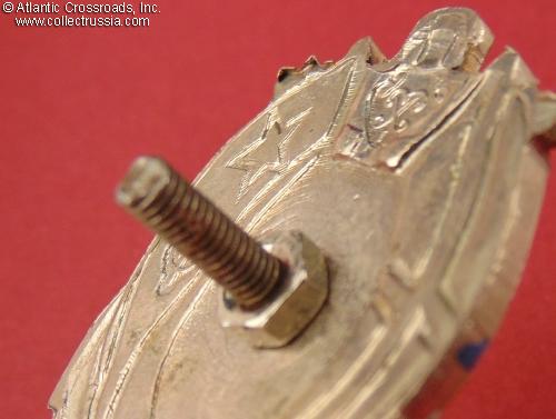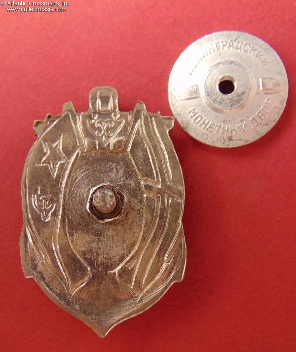 Excellent condition. The enamel and finish are perfect. The screw post is full length and includes a period screw plate with the Leningrad Mint logo, probably original to the badge.