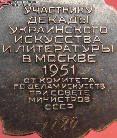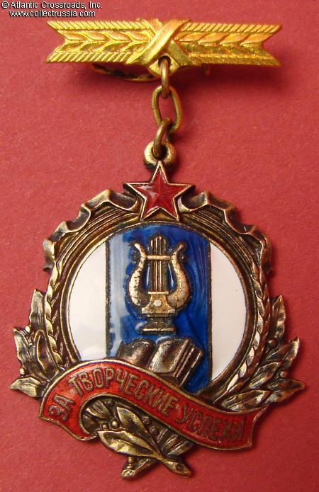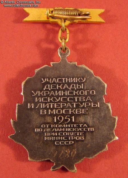 Silver-plated and gilded brass, enamels. The pendant measures 32.4 mm tall (incl. eyelet), 27.8 mm wide. Very elegant design with lyre, book, wreath and the requisite red star topping a cogwheel. The writing in the red scroll is "For Creative Successes". The reverse has engraved serial number "1180" and raised inscription "To a Participant of the 10-Day [Festival] of Ukrainian Art and Literature in Moscow, 1951, from the Committee for Arts at the Council of Ministers of the USSR".