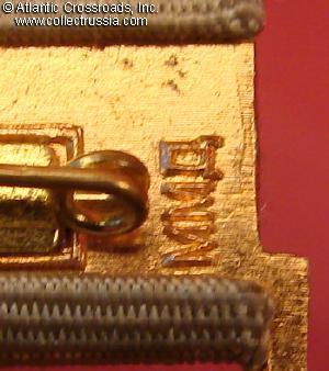 In brass and enamels, beautiful quality. Medallion measures 32.6 x 28.8 mm. Raised maker mark "MMD" (Moscow Mint) to the reverse of the suspension device.