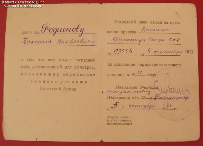 Issued on 5 September 1951 to Nikolai Rodionov. Hand-signed by the school commander, a Major General (the name is unclear) and show ink stamp of the school (very faint and illegible).