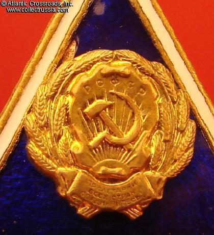 In very fine condition. There is a very small, barely noticeable enamel chip near the edge, just above and to the left of the RSFSR emblem. The enamel is perfect otherwise, showing nice luster and free of buffing, flaking or scratches. Few tiny dings to the