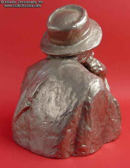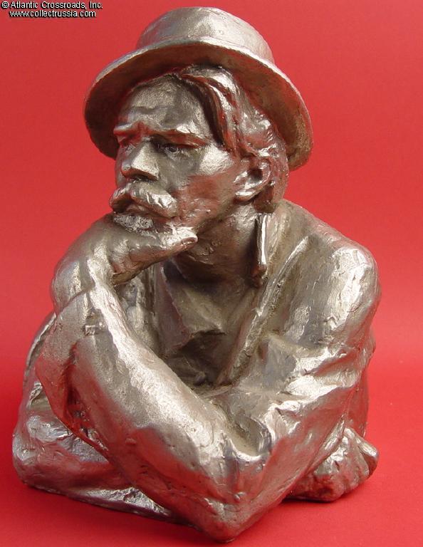 Large 9.5" tall x 7" wide size. Artistic rendering showing him in his trademark fedora, in a thoughtful pose. Of the wide array of official Soviet portrait sculptures, this one stands out as unusual for being a civilian and in a relaxed pose and dress. Likewise, it is a complicated casting, with an open space under the forearm, which requires a special mold that will release it. Uncommon.