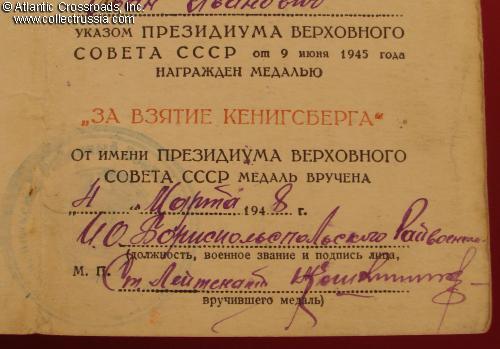 Document for Capture of Koenigsberg Medal, awarded on 4 March 1948 to Private Ivan Petrus.