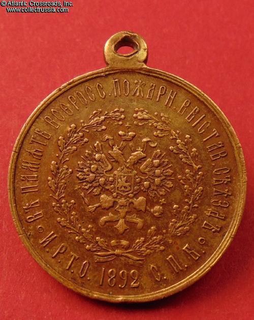 In brass, 28.2 mm wide. Very attractive piece showing firefighting insignia in 3-d profile on the obverse. The reverse has double-headed eagle emblem and raised inscription "In Commemoration of the All-Russia Firefighting Convention and Exhibition, SPB (St. Petersburg) IRPO (Imperial Russian Firefighter Society) 1892".
