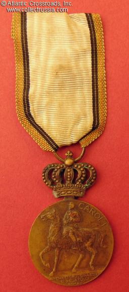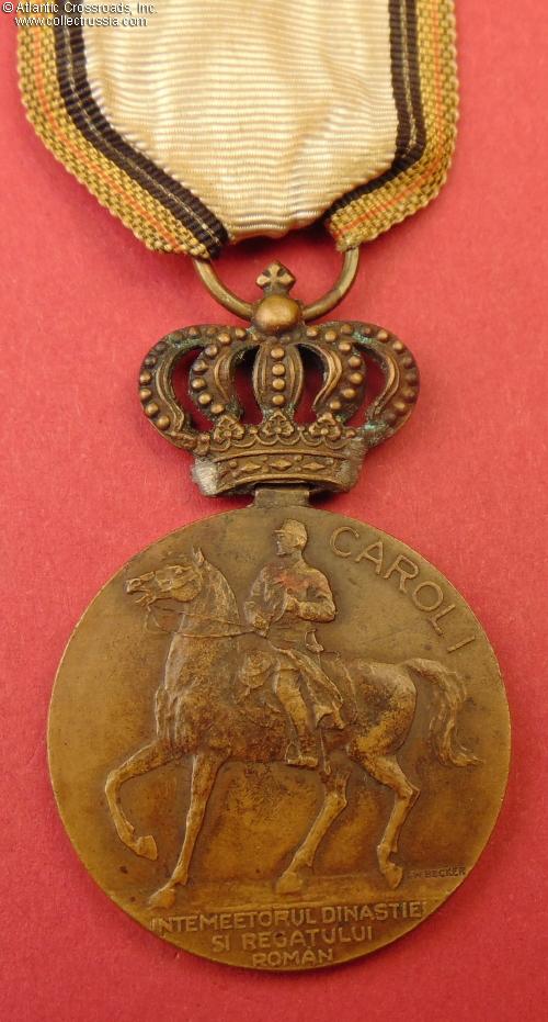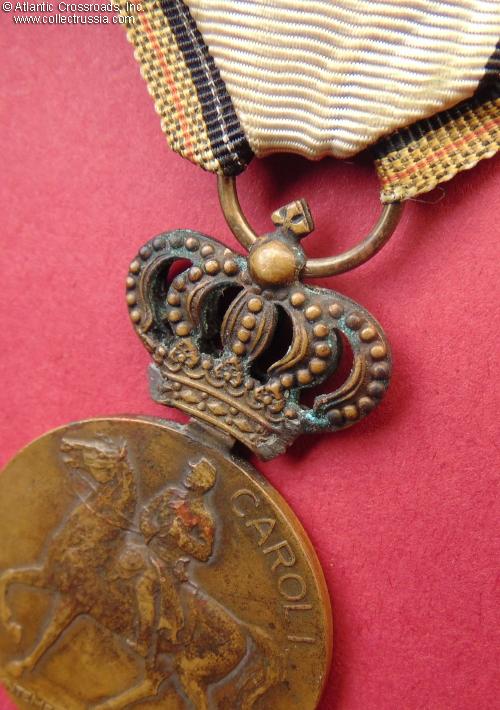 In brass, 35.2 mm wide. Early version featuring pierced crown on swivel attachment (as opposed to simpler examples with solid crown fused with the medallion). The obverse has equestrian portrait of King Carol I, the first king of Romania. The raised inscription under the portrait is INTEMEIETORUL DINASTEI ŞI REGATULUI ROMĀN ("The Founder of the Dynasty and the Romanian Kingdom"). The reverse is inscribed 100 ANI DE LA NAŞTEREA PRIMULUI REGE AL ROMĀNIEI, SLAVITU-SA IN DOMNIA REGELUI CAROL AL II-LEA ("100 Years Since the Birth of Romania's First King, Celebrated during the Reign of Carol II").