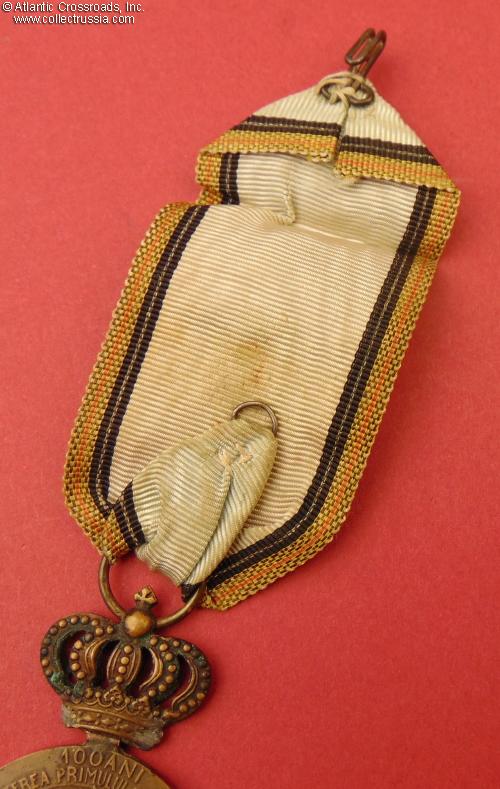 In brass, 35.2 mm wide. Early version featuring pierced crown on swivel attachment (as opposed to simpler examples with solid crown fused with the medallion). The obverse has equestrian portrait of King Carol I, the first king of Romania. The raised inscription under the portrait is INTEMEIETORUL DINASTEI ŞI REGATULUI ROMĀN ("The Founder of the Dynasty and the Romanian Kingdom"). The reverse is inscribed 100 ANI DE LA NAŞTEREA PRIMULUI REGE AL ROMĀNIEI, SLAVITU-SA IN DOMNIA REGELUI CAROL AL II-LEA ("100 Years Since the Birth of Romania's First King, Celebrated during the Reign