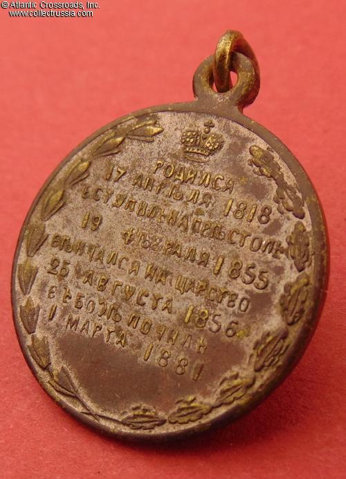 In copper with silver plating; measures 26.8 mm wide; weighs 6.0 g (without connecting link.) The obverse features a memorial complex to the late tsar built inside the Moscow Kremlin with the date of its official opening, 16 August 1898. The inscription along the upper edge is "To the Tsar - Liberator of the People." The reverse shows major dates of Alexander II's life: "Born on 17 April 1818; Assumed the Throne on 19 February 1855; Crowned Tsar on 26 August 1856; Rested in God on 1 March 1881."
