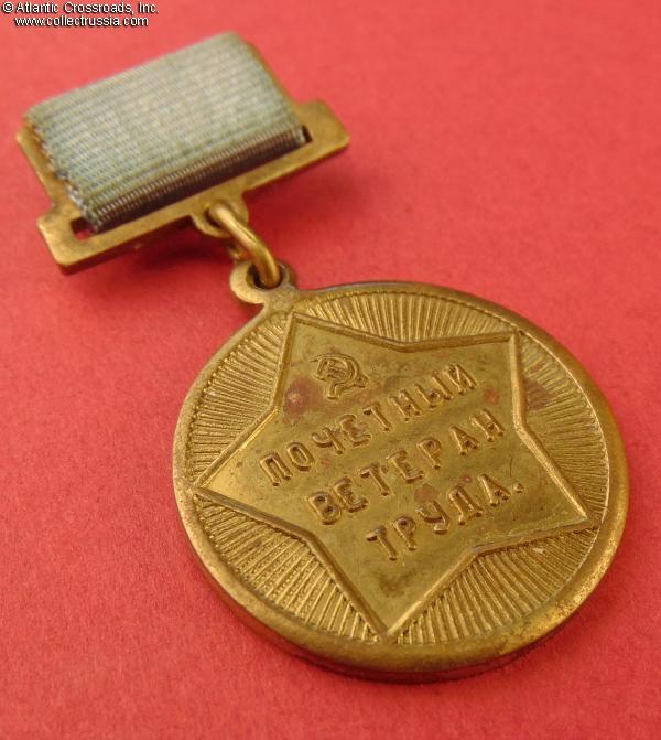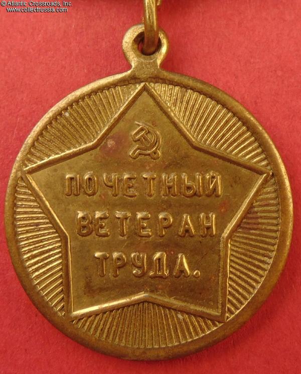 In brass; medallion is 29.0 mm wide; weighs 17.6 g including the suspension. The obverse has inscription "Honored Veteran of Labor". The reverse shows the current factory logo with stylized letters "MVZ" (for Московский Вертолетный Завод) and inscription "Named after M.L. Mil".