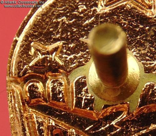 In brass end enamels; approx. 47 mm tall not including the pendant. Includes standard pendant designating 1 or 2 parachute jumps. Raised Pobeda Factory logo on the reverse.