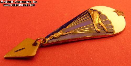 Brass, enamels; 49.5 mm tall (not including the pendant) x 22.3 mm wide. Features early style airplane and larger, more detailed image of the paratrooper turned slightly to the left (as compared with the later issues). Note also the wider space between the right and left suspension lines. There is early- style hexagon logo of the Pobeda Factory on the reverse in the upper right. The pendant is reversible, for making 1 or 2 jumps.
