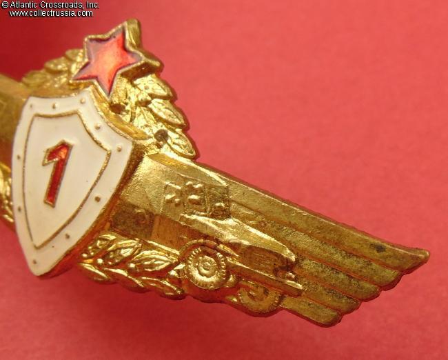 Brass gilt, "cold" enamels; measures 64.5 mm wide x 26.5 mm tall. The badge is very similar in its design to the contemporary Soviet badge of a Tank Driver. The numeral in the center shield designates proficiency level (3 being the lowest and 1 the highest).