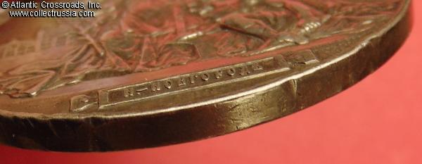 Measures 51.5 mm wide; weighs 60.0 g. Obverse shows a coinage portrait of Nicholas II and inscription "By the Grade of God, Nicholas II Emperor and Autocrat of All Russia. The reverse features an allegoric figure of Mother Russia wearing a crown; she is honoring with a wreath a man and a woman who presented her with the fruits of their labor. The sprawling buildings hosting the exhibition are visible on the background. On the lower portion of the reverse appear the name of the artist N. Samokish and die-cutter Grilikhes the Son who jointly created the model for the medal.