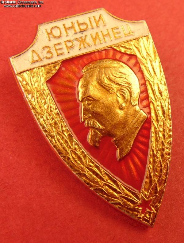 Aluminum, paint; 37.1 x 24.0 mm. Features portrait of Felix Dzerzhinsky. Issued to members of the Young Pioneer police enthusiast unit. In excellent condition.