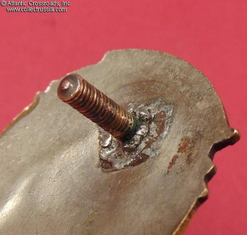 Early type in silver-plated and gilded brass and enamels; measures 37.5 mm tall x 31.5 mm wide; weighs 14.0 g without the screw plate. This version of the badge is almost for sure of Soviet manufacture.