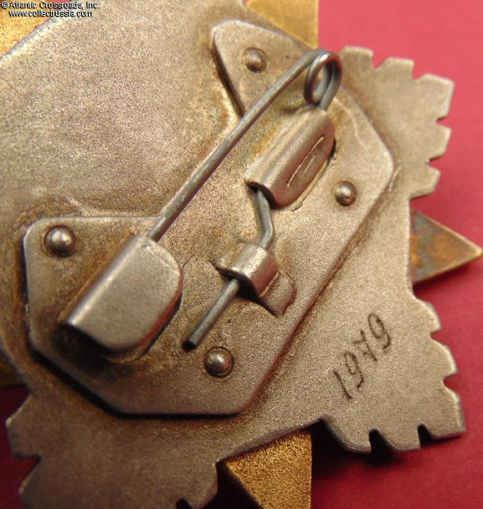 Solid 23 K gold, platinum, silver and enamels. Measures 53.0 mm in height, 50.8 mm in width; weighs 59.2 g. Gold star superimposed on a sunburst of blue enamel, with gray circle in the center and superimposed platinum bust of Sukhbaatar (aka Sukhe-Bator), Mongolian revolutionary leader; above the portrait is the red flag with Sukhbaatar's name in Cyrillic. Features Type 2 pin back attachment. Note the extremely high serial number 1979 engraved on the reverse by a rotating tool in standard manner. This specimen is from the small last series of 300 pc with the serial numbers 1701-2000 that were manufactured by the Moscow Mint and delivered to the Mongolian Government in 1985-86. Since Mongolian awards were issued in the order of their serial numbers (unlike Soviet decorations), it was also among the last of the Order of Sukhbaatar ever awarded.