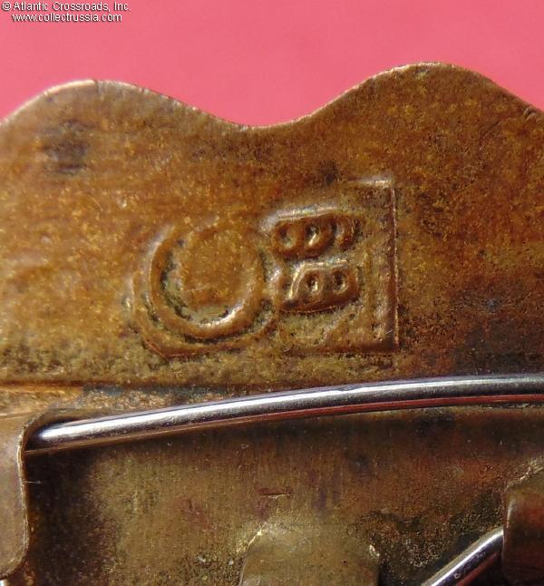 In brass and enamels, 26.3 mm tall, 34.1 mm wide; very nice quality. Features flat reverse with raised stylized Cyrillic П ("P") in a circle, an early maker mark of the Pobeda Factory, with an additional characters next to it that look like a "68" (as far as we know, this is not the year of manufacture.)
