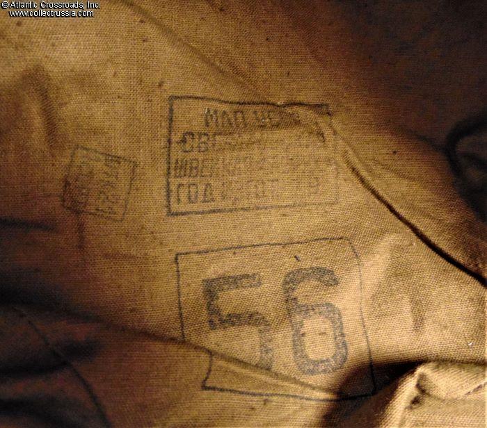 A very sturdy construction in rugged light olive drab cotton. The hat has a sharply downward-pointing visor. There are green buttons on the back that were designed for the extra fold-down neck flap that would provide protection against blowing sand. The liner shows a stamp of the garment factory in the city of Sverdlovsk with a 1979 date of manufacture, probably the earliest date we have seen for a hat of this type. The size is 56 (Medium, corresponds with approximately US size 7 but will probably even fit up to size 7 1/8 head.)