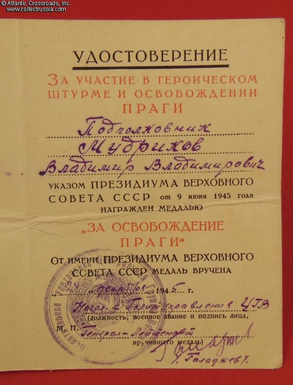 Document for a Liberation of Prague Medal, issued on 24 December 1945 to Lieutenant Colonel Vladimir Mudrikov.