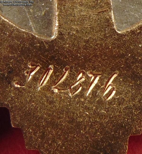 The order is in excellent, near mint condition. As would be expected of the award that was never worn, the enamel shows magnificent luster and is completely free of any wear that could be found even under a 10x magnification. The golden hammer & sickle emblem and starburst are likewise pristine. There is very attractive toning to the silver and gold parts. The screw post is full length, approx. 14 mm long measured from the reverse of the silver star. Comes with the original screw plate of early post-war type.