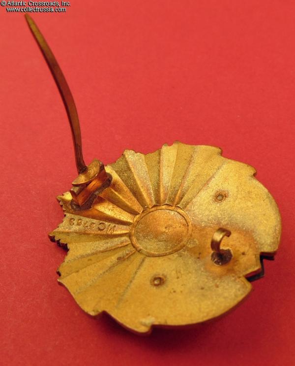 Brass, enamels; measures 45.6 mm in height, 43.5 mm in width; weighs 30.8 g. Riveted three-piece construction: the sunburst with orange center and the gold wreath with the hammer and sickle emblem are separate superimposed parts. The plaque at the bottom has an inscription "RPR" (Romanian People's Republic, the early name of the communist Romania which was replaced with RSR in 1965) The catch for the pin is of simple construction, an early feature that changed to the more complex "full closure" design at some point in the early 60s. There is a stamped serial number Mc 1753 in the upper part of the reverse near the base of the pin .