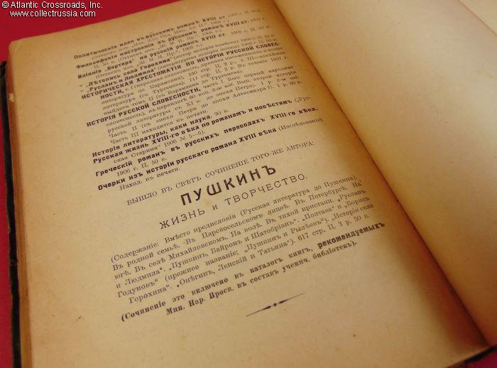 Measures 9" x 6.5", 250 pp., leatherette-bound hard cover. Russian text in pre-1917 reform orthography which contains currently obsolete letters. Published by Bros. Bashmakovy Publishers, St. Petersburg. This particular copy was originally sold by E. Bruns' Books and Pictures Store in Riga, Latvia. The book is very well-structured. After the preface opining on literature as a science and the role of Russian literature in general, the book elaborates on chronological period of Russian history as it reflects in literature from Kiev Rus of XI - XIII cc. and on to later periods with centers in north-eastern Russia and, finally, the "Moscow period" up to XVIII century.