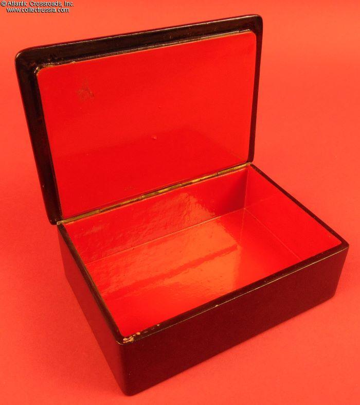 The lacquer box is in excellent condition. The image is essentially pristine, its original luster fully preserved. The lacquer has no cracks, two tiny scuff marks on the black background toward the top left corner are almost unnoticeable. The bottom shows several very thin scratches that do not reach through the finishing coat of lacquer. There are no significant cracks, discoloration spots or other serious wear. The shipping box is very brittle where its parts were originally glued together but now show minute separations in some places. It should be handled with utmost care.