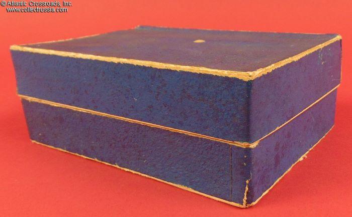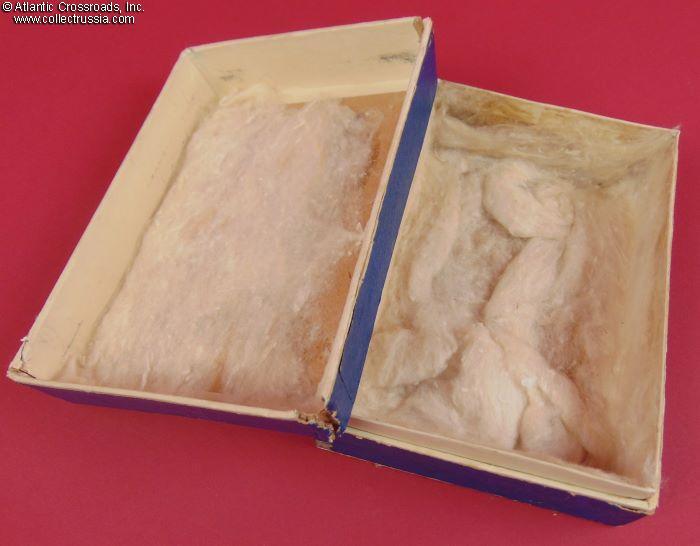 The shipping box is padded with cotton wool. The manufacturer's quality control label is well preserved, glued to the bottom of the shipping box and is worthy of special mention. It consists of two parts in square frames, the left one carrying the name of the item, its quality rating ("1" stands for high quality) and the month and year it left the factory (December '69). Notice that it took at least almost an entire year for the box to get through quality control and be ready for shipping. This level of disorganization was quite common in the manufacturing facilities of the Soviet industry guided by the requirements of centrally planned economics. The square on the right is made of microscopic lettering identifying the factory, its location and its designation as an "enterprise of artistic industry". Inside the square is the logo of the factory surrounded by its full name "Fedoskino Factory of Miniature Art".